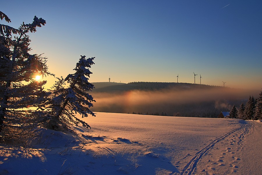 In Richtung Sachsenbaude gab es einige letzte Nebelschwaden. Ich mußte aber noch etwas warten, denn um in die Suppe hineinfahren zu können, braucht es eine Sonnenhöhe von mind. 5°C, damit die Sonne über dem Keilberg hinauslugt. Die Hände und das Gesicht habe ich irgendwann nicht mehr gespürt, aber aufgeben wollte ich auch nicht. Auf dem Weg nach unten (leider nicht weit genug, um dem Auto einen Hauch von Wärme zu entlocken) strahlte mir dann bereits unterhalb des Parkplatzes eine Unternebensonne entgegen. Ich hielt am Straßenrand, nahm das Hupen der anderen gelassen hin und machte ein paar erste Aufnahmen.