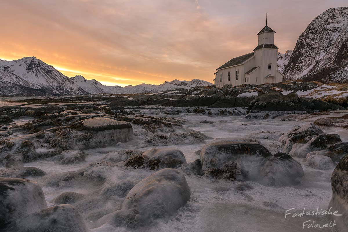 Unser nächstes Ziel zum Sonnenaufgang war wieder die Kirche, die wir bereits eine Tage zuvor für Polarlichter im Visier hatten. Während die zurückliegende Nacht sternenklar war, gab es am Morgen zum Glück wieder Wolken, welche einen wahnsinnig intensiven Sonnenaufgang brachten. Bei den Bildern habe ich zum Teil die Sättigung zurückgedreht, weil das rot übersättigt war.