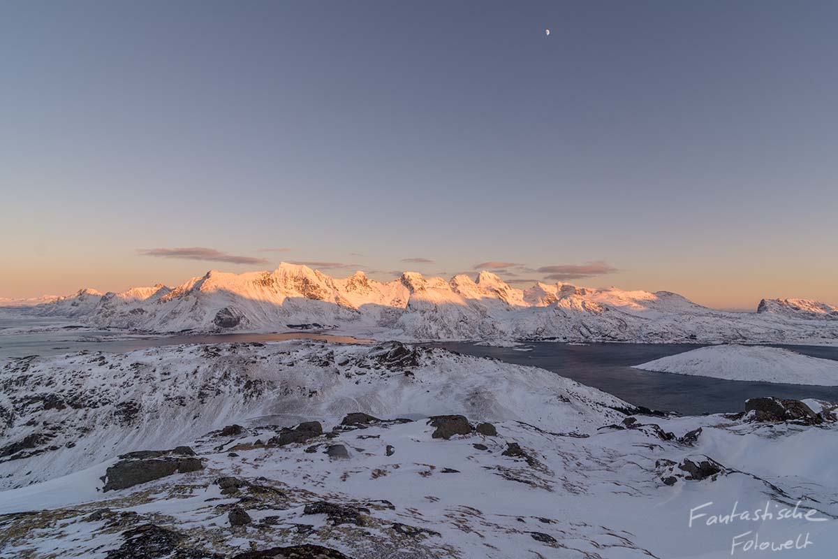 Auf der anderen Seite knallte die Sonne in die weißen Berge, sodass es ein tolles farbiges Gebirge gab – Alpenglühen oder besser gesagt Lofotenglühen.