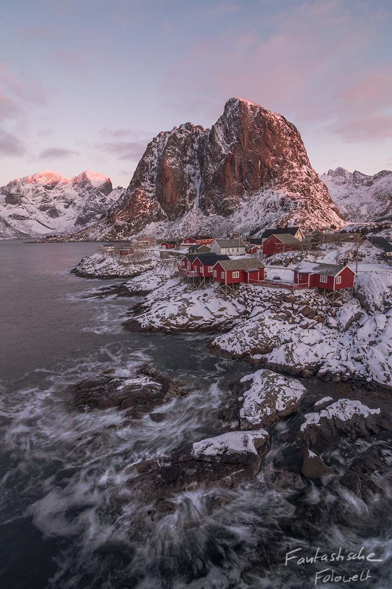 Nun sind die letzten 24 Stunden angebrochen, in denen wir als erstes zum Sonnenaufgang nach Hamnoy gefahren sind. Als wir losgefahren sind, war es noch komplett bewölkt, im Laufe der Dämmerung hat es dann aber nahezu komplett aufgeklart. Die Lofoten konnten deshalb schön im ersten Sonnenlicht glühen.