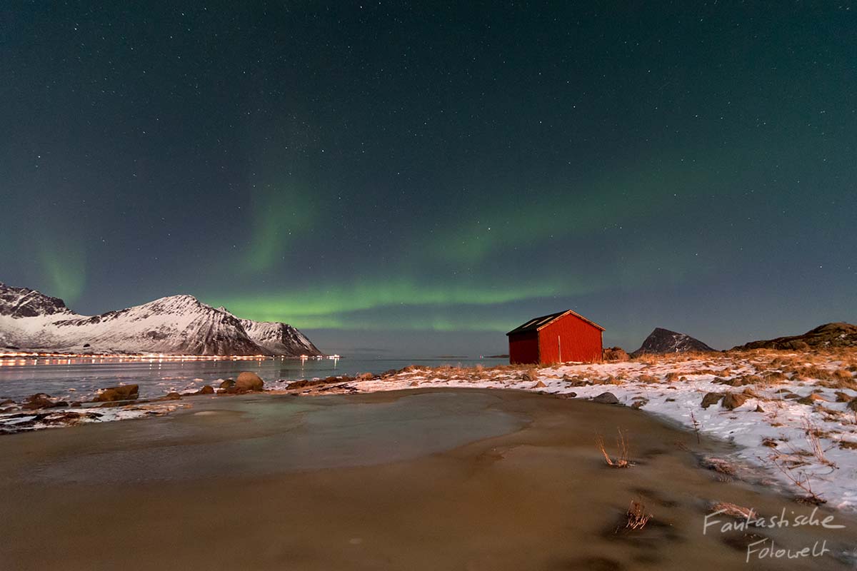 Das letzte Bild noch, bevor das Polarlicht tendenziell wieder schwächer wurde und wir schließlich zum eigentlichem Ziel, dem Haukland Beach gefahren sind.