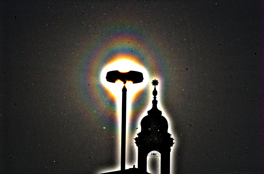 13:40, f = 138 mm: 18:33, f = 138 mm: 19:46, f = 80 mm: 19:48, f = 80 mm: 20:13, f = 138 mm: 20:13, f = 138 mm: Interessant ist beim letzten Bild die Dreierstruktur im oberen Bereich des dritten Rings nach der Aureole. Die Sonnenhöhe war zu dem Zeitpunkt 2,4°. Ich weiß nicht, ob sowas schonmal dokumentiert wurde. Meist sind es ja die Lichtknoten am ersten Ring, die bei tiefem Sonnenstand auffallen, und der zweite Ring sieht sehr gleichmäßig aus. Ich versuche mich gerade an einigen Simulationen dazu.