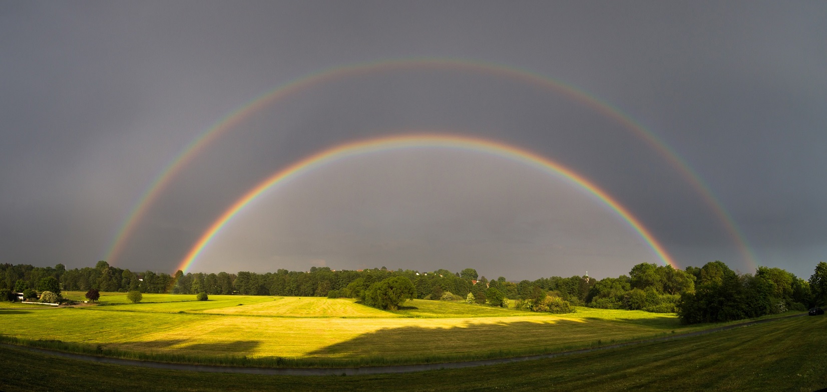 Am 13.Mai hatte ich nach einem sich auflösendem Gewitter, die Möglichkeit spontan durch wenige Kilometer fahrt an den Rand des Schauers und so in die Sonne zu gelangen. So konnte ich dann einen Regenbogen in seiner ganzen Pracht genießen. Zu dem war er mit über 30 Minuten recht langlebig. Als der Regenbogen sehr hell war habe ich aus neugier auch mal ein Bild in die Gegenrichtung gemacht vielleicht lässt sich ja auf dem Bild noch was finden. Und tatsächlich mit starker Bearbeitung und USM am Bild kann man ihn ganz schwach sehen.