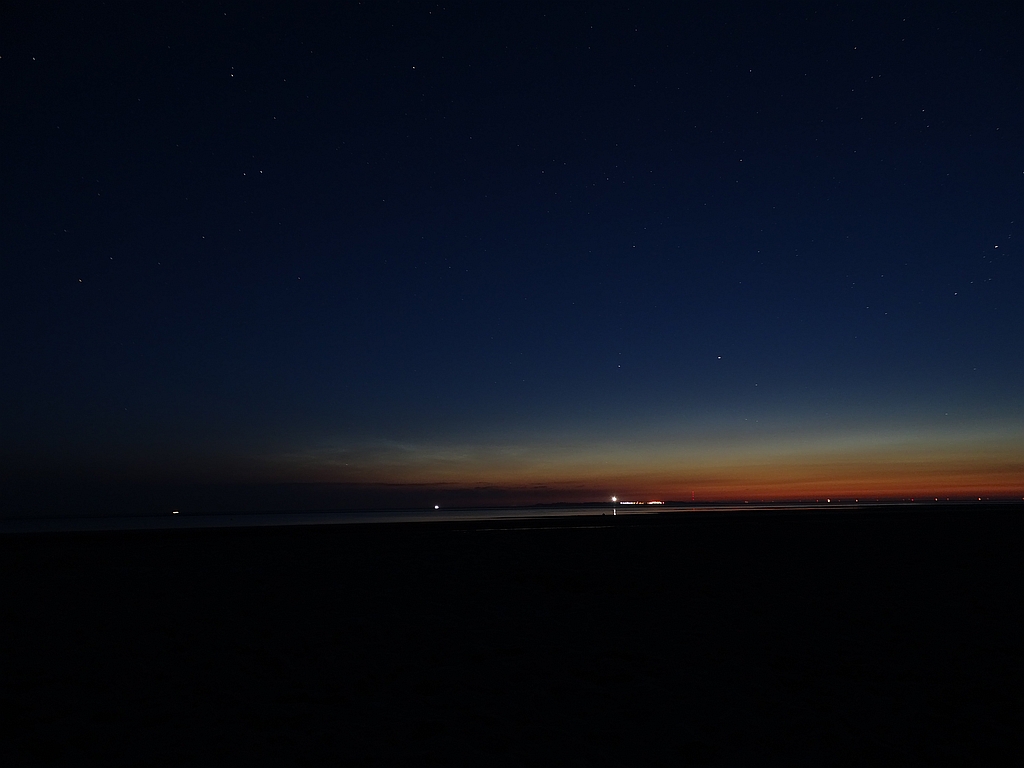 hier ein Belegfoto vom Norddorfer Strand (Blickrichtung Hörnum/Sylt), wo ich das Display zusammen mit steffi kister beobachten konnte. Es war ziemlich lichtschwach und fiel uns erst auf Fotos auf, die wir um die astronomische Mitternacht zur Dokumentation des maximalen Dämmerungsgrades aufgenahmen.