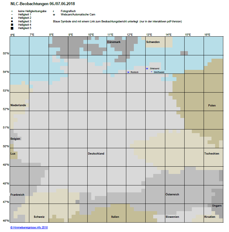 der frühe Morgen des 07.06.2018 brachte ein weiteres sehr lichtschwaches NLC-Display, welches ausschließlich an der östlichen Ostseeküste nachgewiesen wurde (Abb. 1). Weiter westlich, namentlich auf Amrum, war trotz bester Wetterbedingungen (Abb. 2) nichts davon zu bemerken, weil die Leuchtenden Nachtwolken anders als in der Vornacht recht weit östlich über Südschweden standen (Abb. 3).