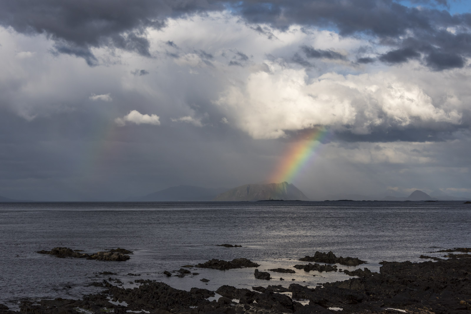 gestern (14.06.2018) konnte ich in einer Regenpause auf der Vogelinsel Runde einen sehr hell leuchtendes Regenbogenfragment (mit Spiegelung