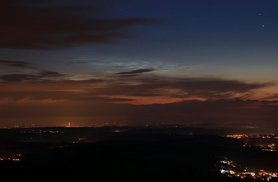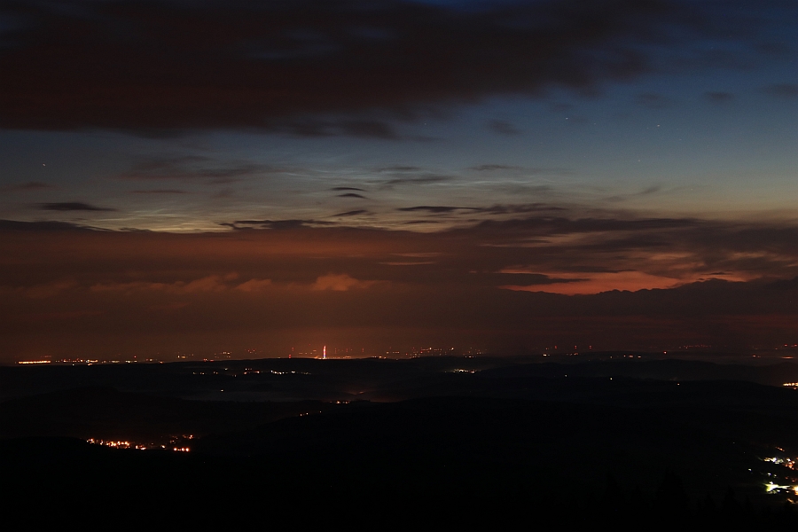 Gestern (17.06.) gegen 23:30 Uhr MESZ hatte ich eine relativ große Wolkenlücke vor Ort, durch die ich Capella extrem hell und "scharf" wahrnehmen konnte. Entsprechend schließe ich auf eine gute Transparenz. Innerhalb dieses 10-minütigen Zeitfensters (bis 23:40 Uhr MESZ) konnte ich, in dieser doch recht großen Wolkenlücke, keine NLC wahrnehmen. Gänzlich auszuschließen ist die Existenz von NLC zu diesem Zeitpunkt, an meinem Standort, sicher nicht - zu viel Gewölk vor dem Dämmerungsbogen. Eine freie Horizontsicht war innerhalb der Wolkenlücke ab ca. 7° Höhe gegeben.