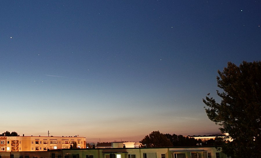 Na immerhin! Das ist doch was! Tief und klein in AZI 025-030 (Sichtbarkeitsgrenze wegen Baum), max. Höhe 4° - 5 °, Zeitraum 22:25 UT - 23:20 UT. Zu der Zeit begann es dann zuzuziehen.