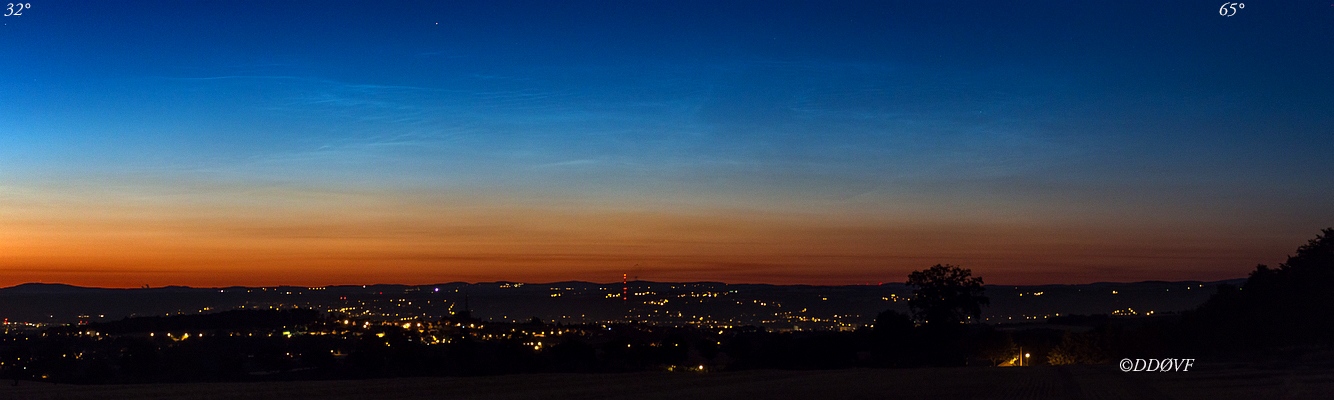 nachdem die Sauerland-Cams ab 02:50 Uhr schwache NLCs zeigten, bin ich sofort rausgefahren. Um 03:15 Uhr war ich an meinem Beobachtungsort, wo mich ein recht unauffälliges NLC-Display (Azimut 353° - 15°, Höhe 3° bei Az. 353° bis 5° bei Az. 15°; Helligkeit 1) erwartete. Zu diesem Zeitpunkt betrug die Sonnendepression 13°. 15 Minuten später, bei Beginn der nautischen Dämmerung um 03:31 Uhr (Sonnendepression 12°), waren die NLCs bereits fast vollständig im heller werdenden Dämmerungsbogen verblasst.
