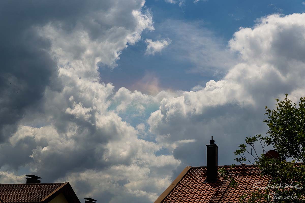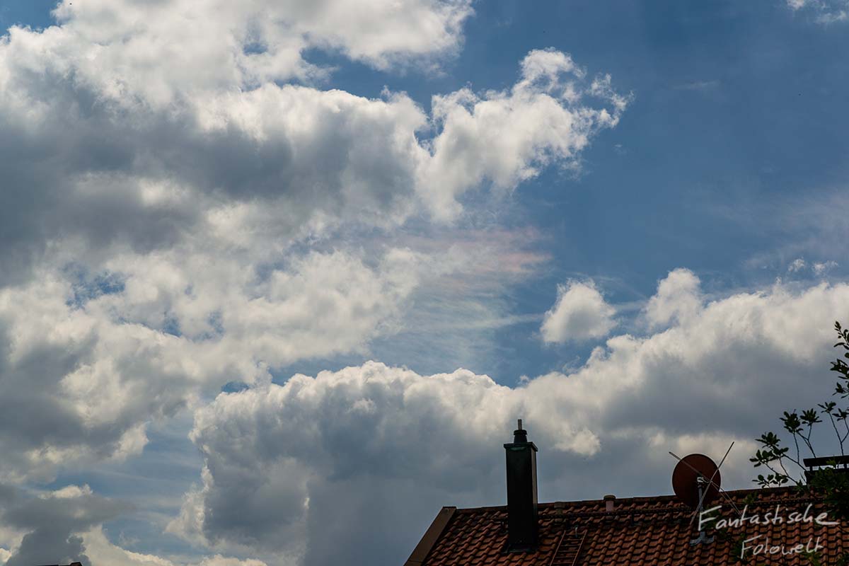 Die zweite Beobachtung war etwas später zwischen immer mehr werdenden Cumuluswolken um 12:39 MESZ. Dieses mal war als erstes ein deutliches rot, kurz darauf waren alle Farben zu sehen, auch ohne Sonnenbrille. Leider haben die Quellwolken den schönsten Teil schnell wieder verdeckt, er war aber bis 12:57 Uhr druchgehend zu sehen.