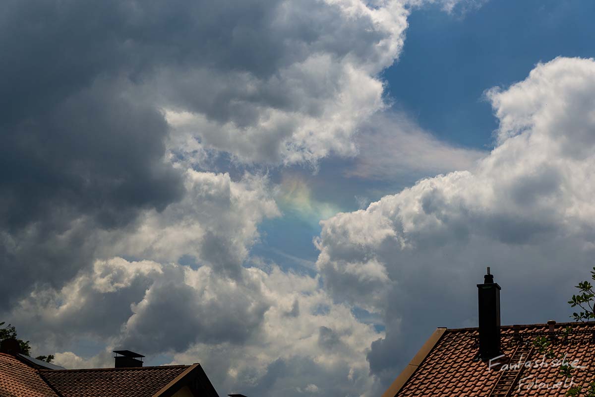 Die zweite Beobachtung war etwas später zwischen immer mehr werdenden Cumuluswolken um 12:39 MESZ. Dieses mal war als erstes ein deutliches rot, kurz darauf waren alle Farben zu sehen, auch ohne Sonnenbrille. Leider haben die Quellwolken den schönsten Teil schnell wieder verdeckt, er war aber bis 12:57 Uhr druchgehend zu sehen.