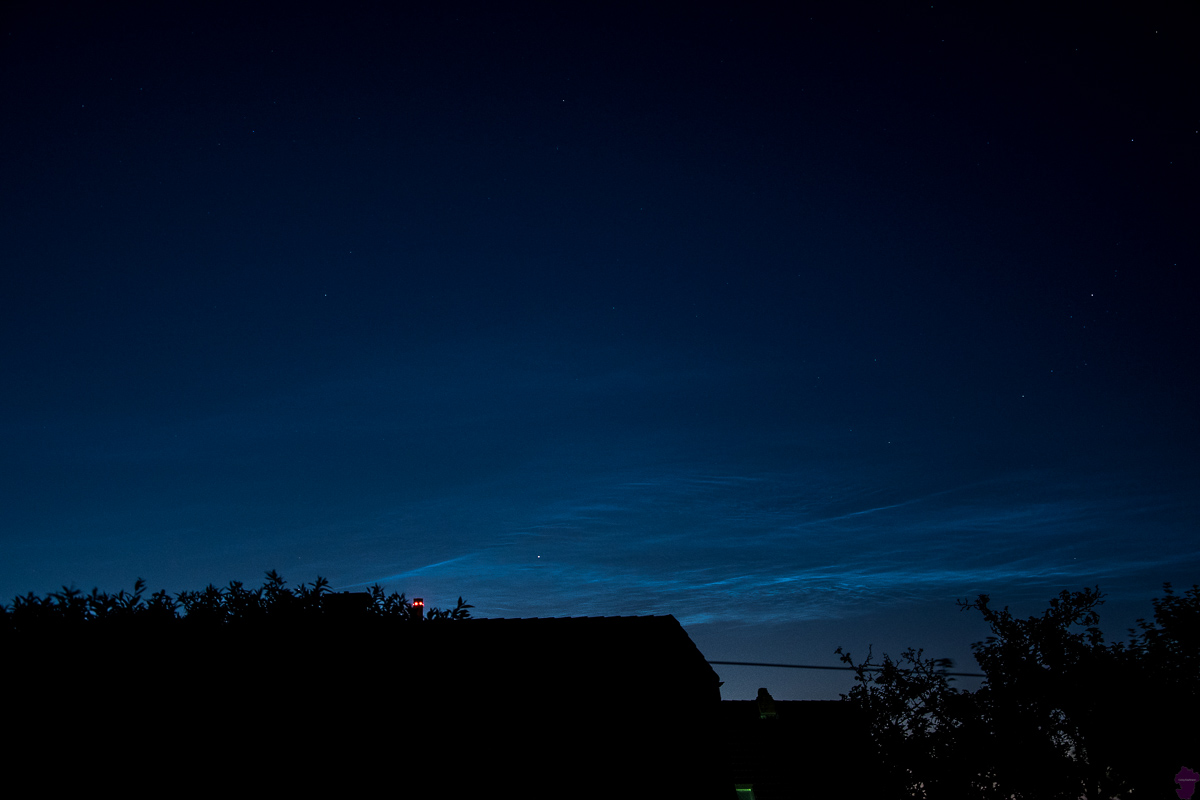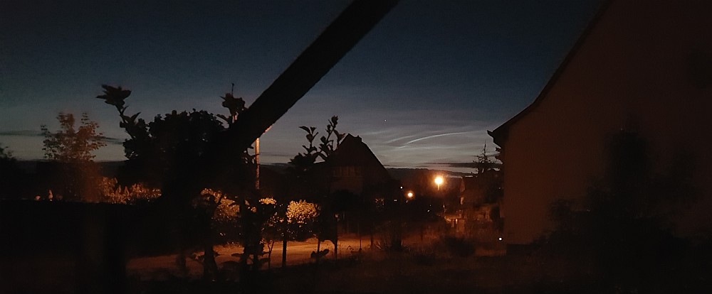 ich habe die NLC´s etwas zu spät bemerkt. Zu Beginn hatte das höchste Feld (12°-16° Höhe) max. Helligkeit 1. Das untere Feld lag bei Helligkeit 3. Nur ein schmaler Streifen leuchtete deutlich heller (=4).Mit abnehmenden Sonnenhöhenwinkel verblassten die NLC innerhalb der nächsten 30 min fast vollständig. Die östliche Ausdehnung ist aufgrund der teilweisen Bewölkung eine Näherung.