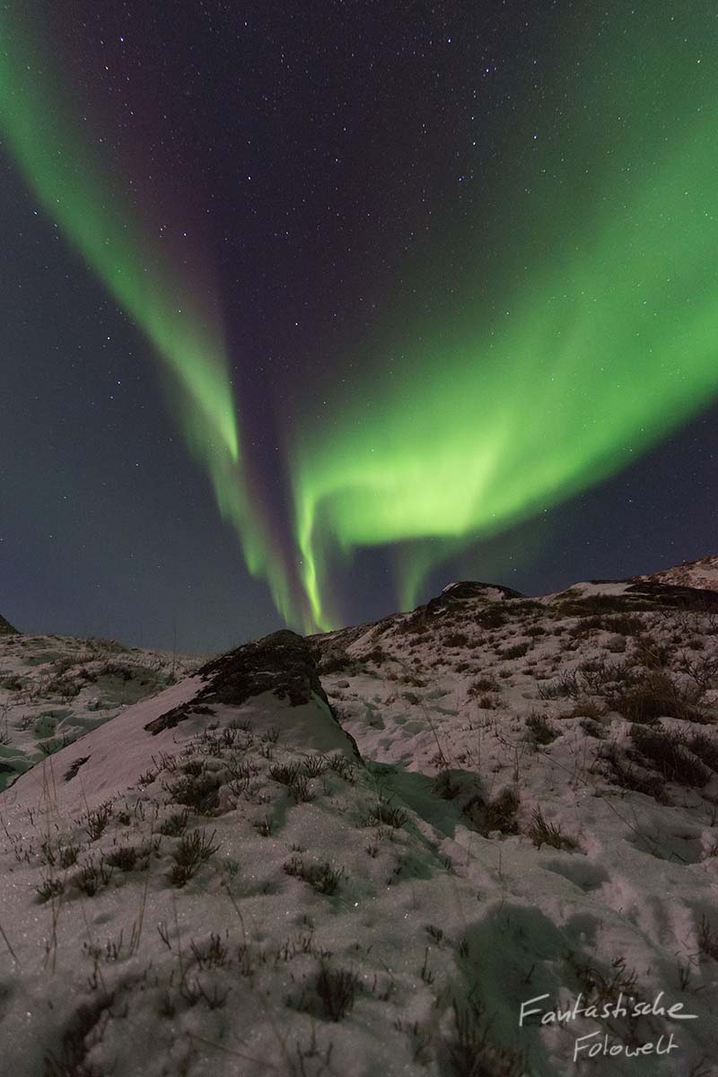 Nach dem Foto haben wir unsere Kameras samt Stativ und Rucksäcken genommen und sind den Berg hochgerannt, bis wir einen besseren Blick nach Osten hatten. Keine Sekunde zu früh denn dann begann das Highlight des Urlaubs, es gab wahnsinnig helle Polarlichter und eine Dynamik, die man selbst mit 1/2s nicht mehr fotografieren konnte. Nun war nur noch genießen angesagt und hoffen, dass die Zeitrafferkamera die Eindrücke irgendwie einfangen kann.