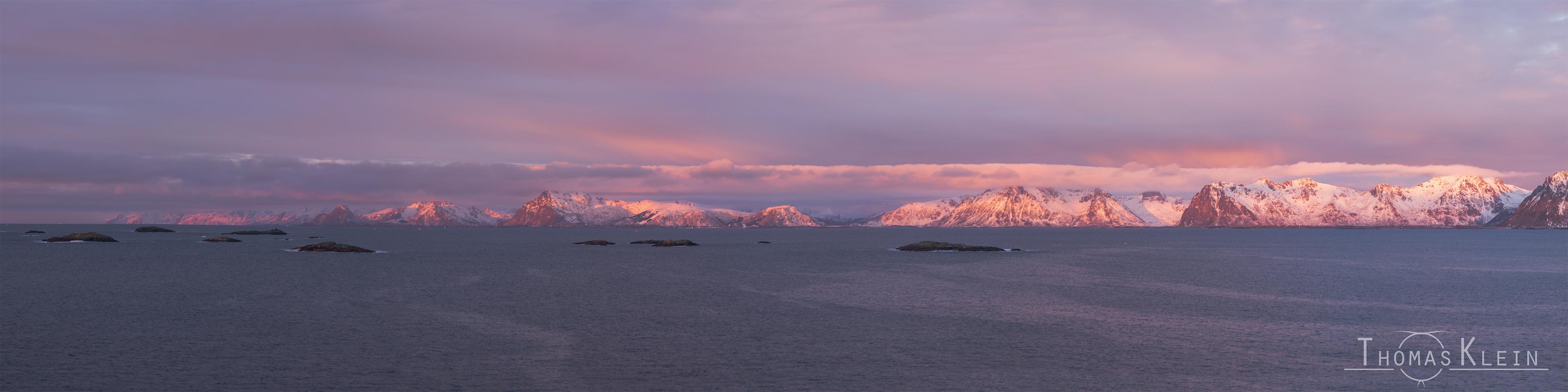 Auf der anderen Seite knallte die Sonne in die weißen Berge, sodass es ein tolles farbiges Gebirge gab – Alpenglühen oder besser gesagt Lofotenglühen.