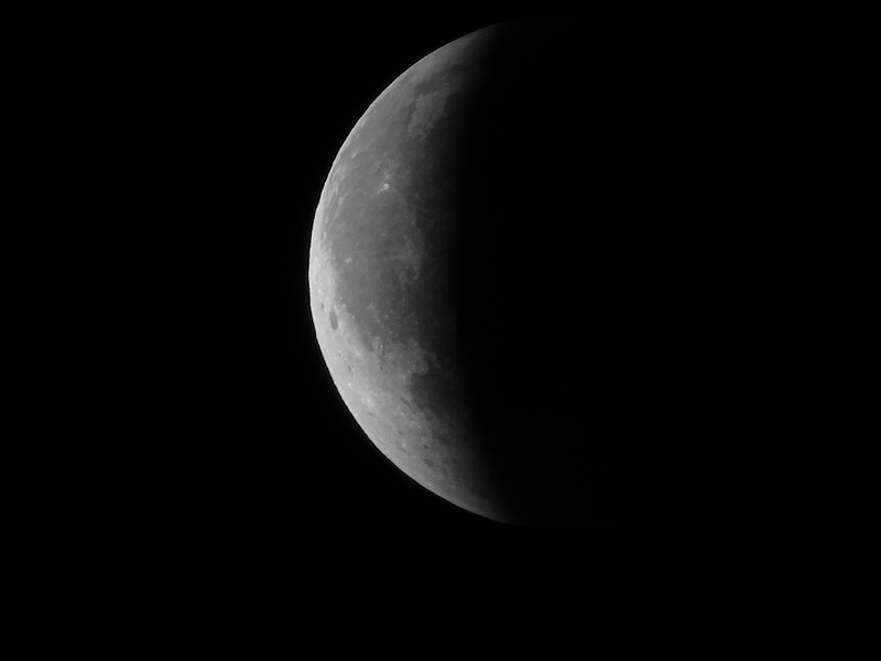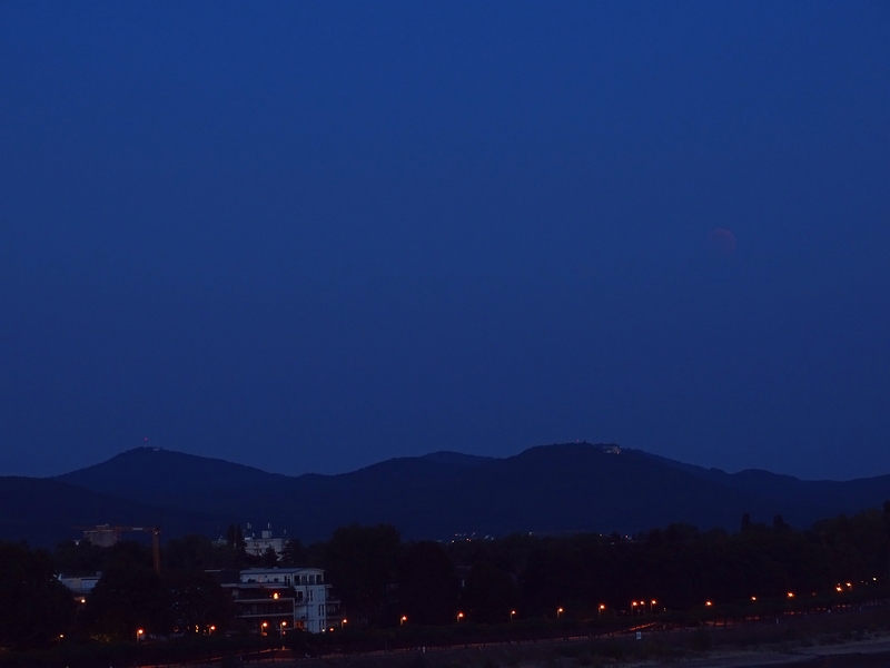 https://tinyurl.com/ybzfu99n), aber seine orangene (also nicht rötlich dominierte) Farbe war durchwegs sehr schön freisichtig. Meine dunkelste Finsternis war die am 15. Juni 2011 mit einer Eklipsenmagnitude von 1,70, die ich unter fast identischen Bedingungen auf Hakos gemessen hatte. Die war mit einem Minimum bei -0,35 m deutlich dunkler als die jetzige (Eklipsenmagnitude 1,61; Minimumhelligkeit -1,83 m), auch in den identischen, fernglasartigen Suchern der verwendeten Minolta-Photometer.**