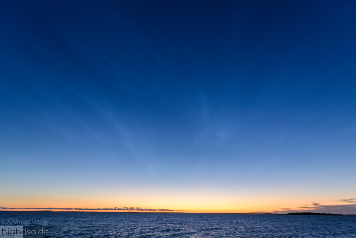Dann fuhr ich schnell nördlich des Flughafens Oulu ans Wasser. Leider gab es sehr starken Wind, so dass ich nur meine Kamera aufstellte und selbst im Auto blieb. Das Display wurde mit der langsam aufgehenden Sonne immer größer und dehnte sich über den ganzen Himmel aus. Wie du es schon beschrieben hattest, Claudi, es war wirklich fast ein 360° Display. Im Süden standen die NLC nur wenige Grad über dem Horizont und waren noch sehr deutlich zu sehen, als der Erdschatten erschien. Hier wäre wirklich mal ein 180° Objektiv sinnvoll.