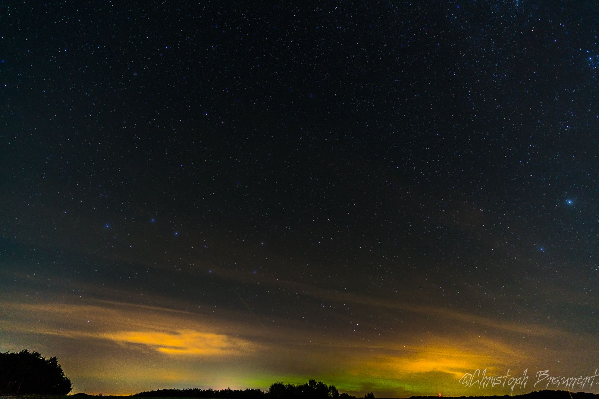 Einen grünen Schimmer am Horizont habe ich eigentlich die ganze Zeit (fotografisch) gesehen, aber es gibt zwei Zeiträume, in denen es stärker war. Zwischen 22:07 und 22:14 MESZ und zwischen 22:42 und 22:54 MESZ (dann bin ich nach Hause gefahren). Im ersten Zeitraum kamen auch schwache Beamer dazu.