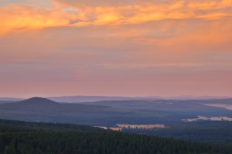 Gestern gab es auf dem Fichtelberg einen morgenroten Streifen. Auf dem Telebild sieht man unseren dampfenden "Vulkan" Kupferberg (Měděnec) im Morgenlicht.
