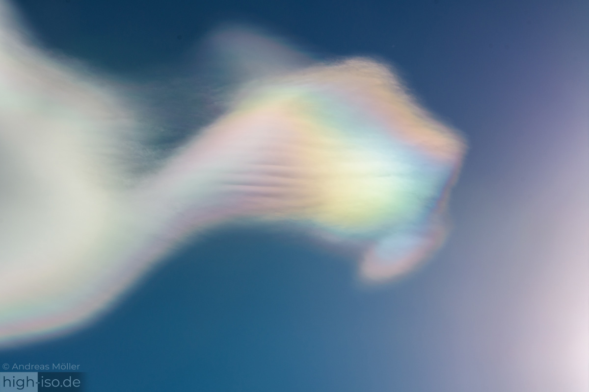 heute vormitag gabs in Dresden (TU-Campus) schöne irisierende Wolken. Wahrscheinlich ging etwas Föhn übers Erzgebirge. Schön war, als sich eine abgegrenzte Lenticularis-Wolke vor der Sonne "festsetzte" und dann ganz langsam wieder auflöste. Dadurch hat das Irisieren über 20 min gehalten.