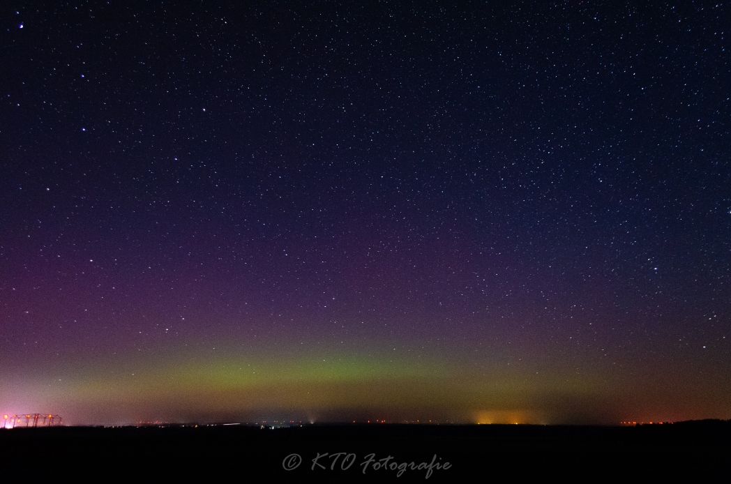Ich konnte in der Zeit von 20 Uhr - ca. 20:30 Uhr fotografisches Polarlicht nachweisen. Ein wandernder grüner Bogen mit violetten Beamern darüber.