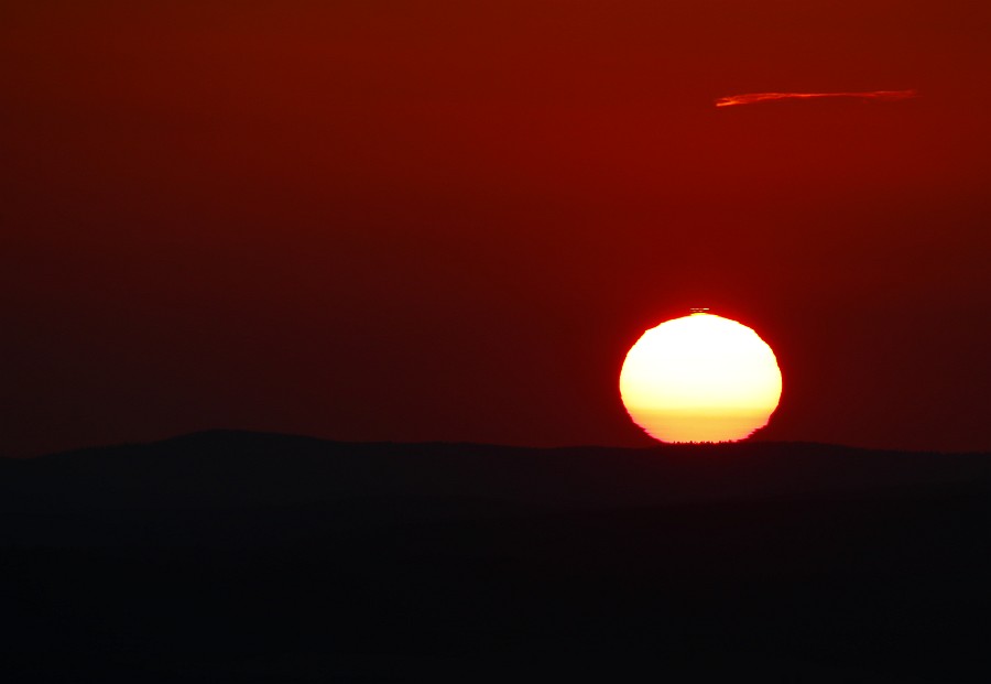 Zu Refraktionseffekten kann ich auch wieder was beitragen. Der Sonnenaufgang war heute Morgen späktakulär. Doch obwohl es ständig neue Fragmente an die Sonne "heranwehte", zeigte sich kein grüner Schimmer, was wohl an der großen Streuung in der verschmutzten Atmosphäre lag. Darum erspare ich Euch auch heute das Video, hier nur einige Frames daraus: