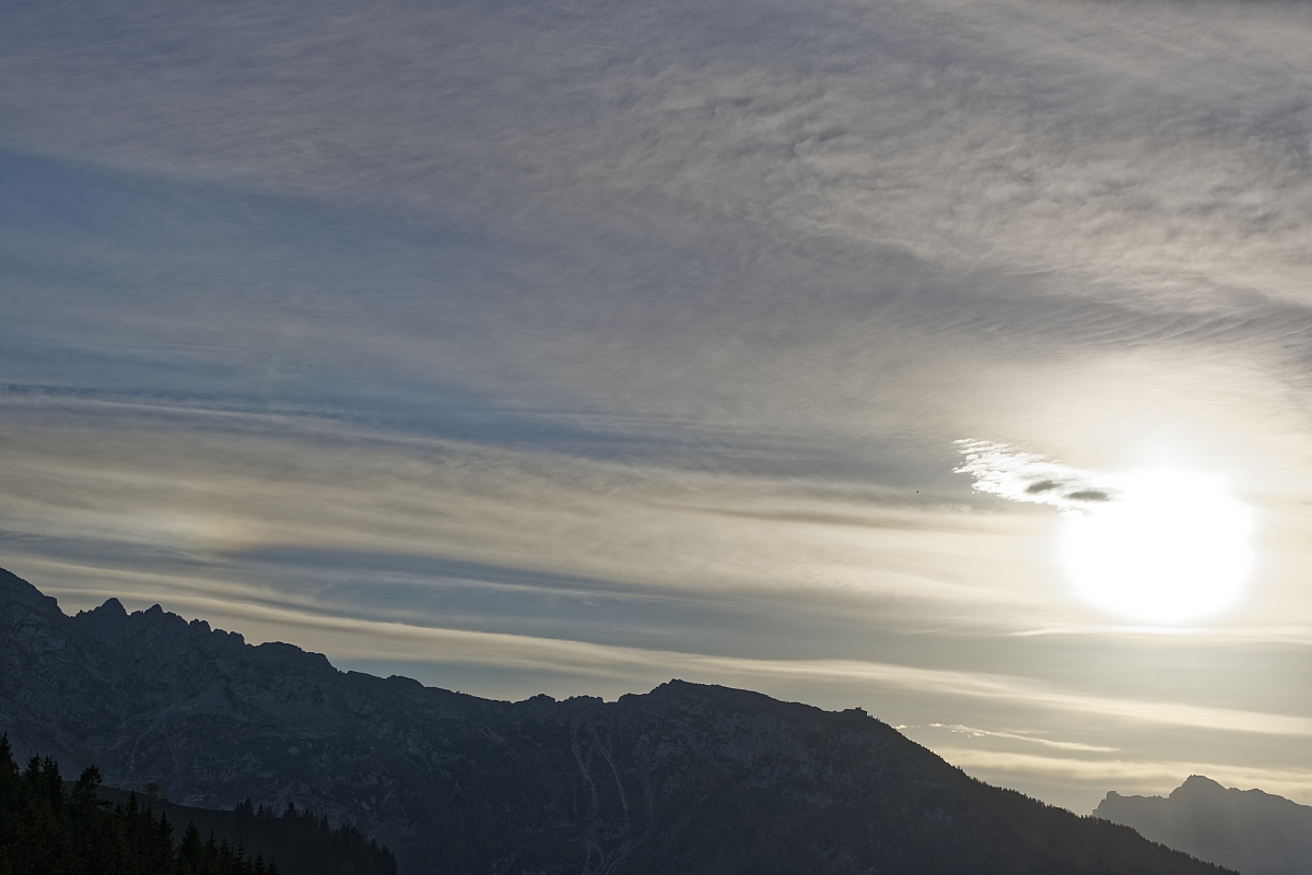 ein auffallend schöner Überfall von Ac un zog sich allmählich über den tagsüber sonst klaren Himmel und bot gen Sonnenuntergang unglaublich intensive Kontraste. Um den Mond herum bildete sich eine sehr intensive Konrona, langsam fließt die polare Kaltluft rein.