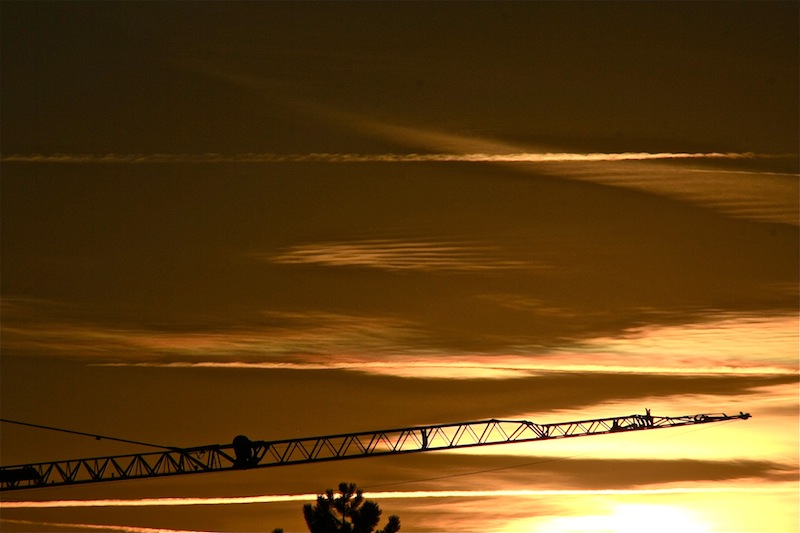 heute gab es allerlei Ausbeute am Himmel. Morgens schon zeigten sich unglaublich stark strukturierte und vom Föhnwind bizzar verwehte Kondensstreifen bei Sonnenaufgang.