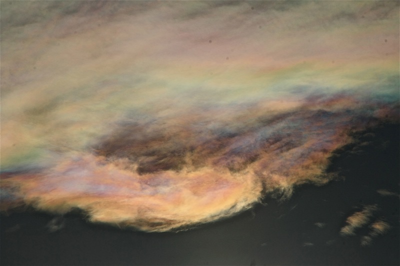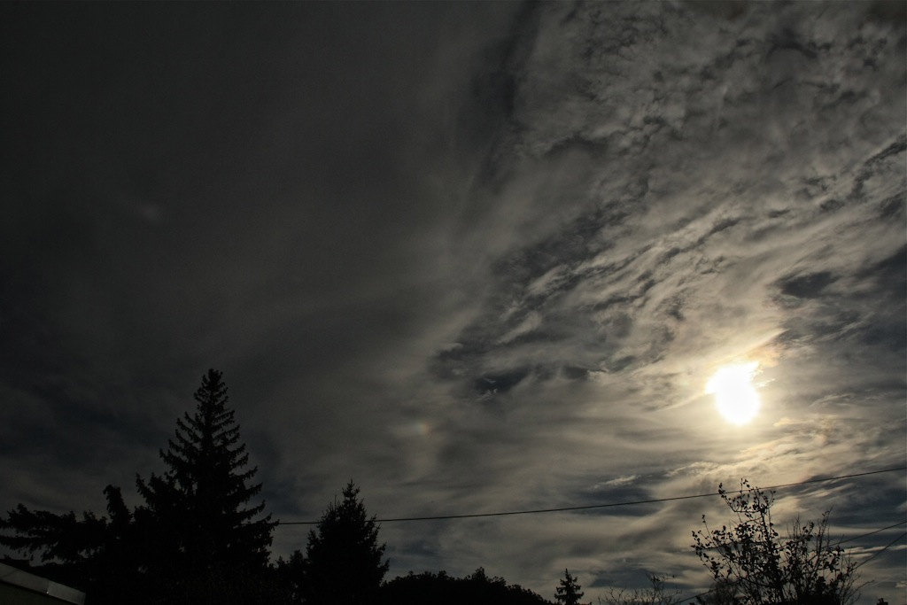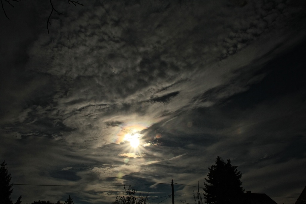 kurz nach 11:00h zeigte sich unter einem chaotischen zu 7/8 bedecktem Cirren, Cirrostratus und Ac Himmel eine auffallend helle re NS bei um die Null Grad C und einem straffen Wind aus SE mit 3-4 bft. Diese verschwand nach wenigen Minuten wieder und formierte sich immer wieder neu im Laufe des Vormittags. Ein Kommen und Gehen war das. Bald gesellte sich eine deutlich schwächere li NS hinzu, ebenfalls von kurzer Dauer und nur einmal. Bei Zenitstand zeigte sich eine durchbrochene Korona und die zerzausten Ac Wolken waren auffallend stark gefärbt.