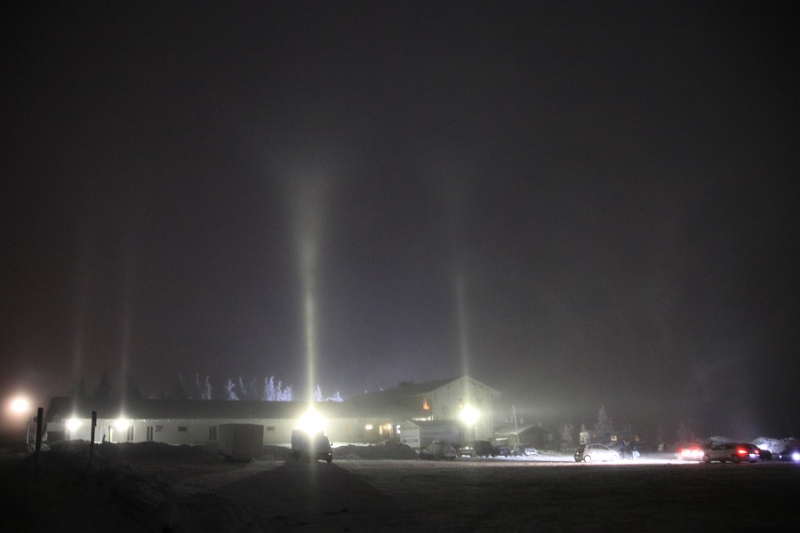 Nach Dienstschluss um 17 Uhr habe ich eine kleine Runde gedreht, als mir auffiel, dass jedes den Berg herunterkommendes Auto Lichtsäulen und/oder 22°-Ring mit reichlich Co. mit sich herschleppte. Ein Stativ hatte ich nicht mit, also hab ich im Schnee experimentiert, bis ich die Hände nicht mehr gespürt habe. Folgende Haloarten waren zu sehen: 22°-Ring, 2 bis 4 Nebenlampen, oberer und unterer Berührungsbogen, obere und untere Lichtsäule, tlw. 46°-Ring, Horizontalkreis(e) und Moilanenbögen.