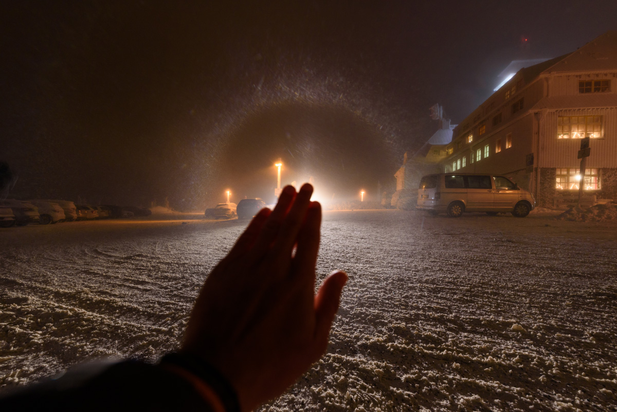 Am besten haben mir die langen Lichtsäulen mit den hellen OBB darüber gefallen. Die gab es noch auf der Heimfahrt an den entgegenkommenden Autos zwischen dem Gipfel und der Sachsenbaude.