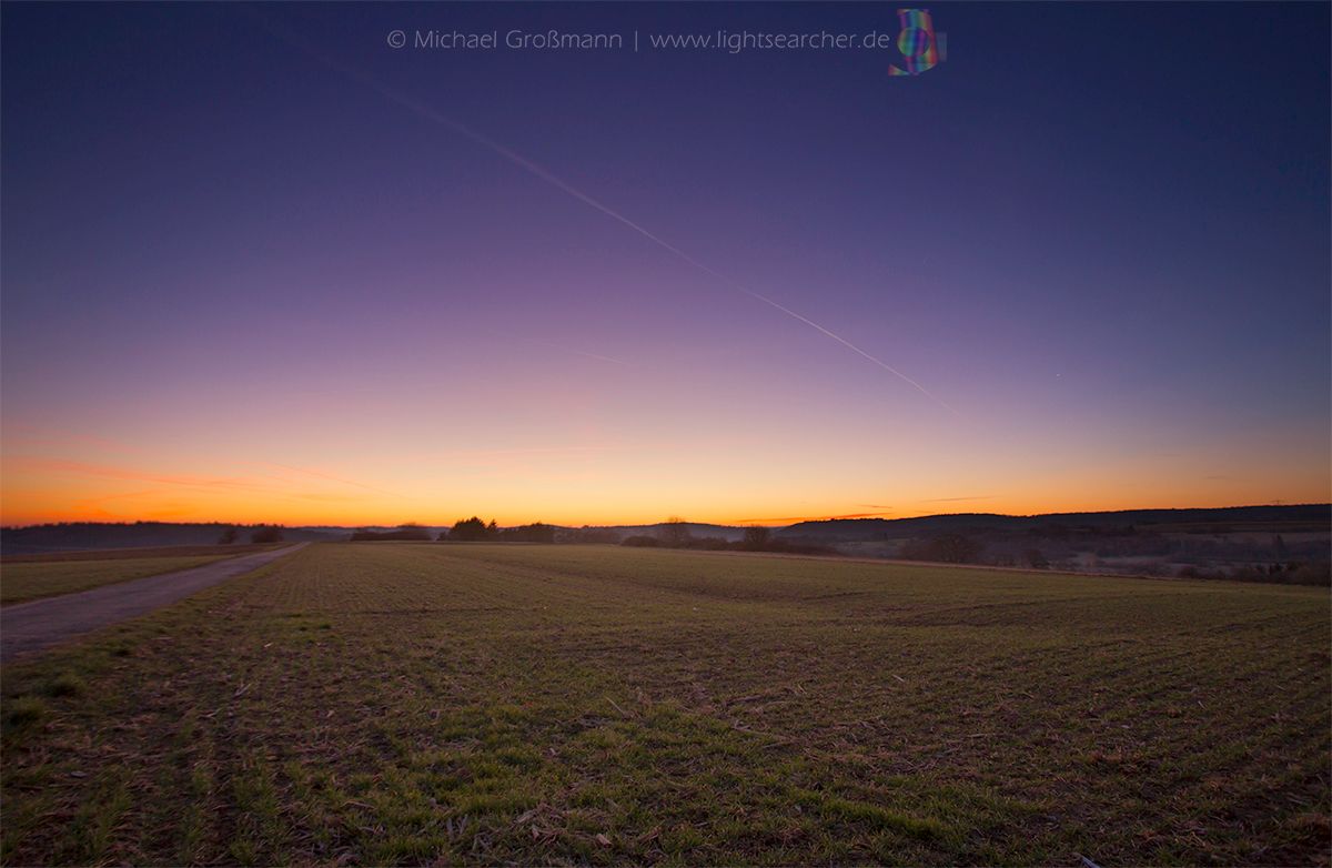 Zur maximalen Färbung war ich leider im Auto unterwegs, an der Serpentinenstraße in Richtung Bad Hindelang habe ich aber ziemlich genau 1 Stunde nach Sonnenuntergang immer noch ein intensives rot gesehen und fotografiert.
