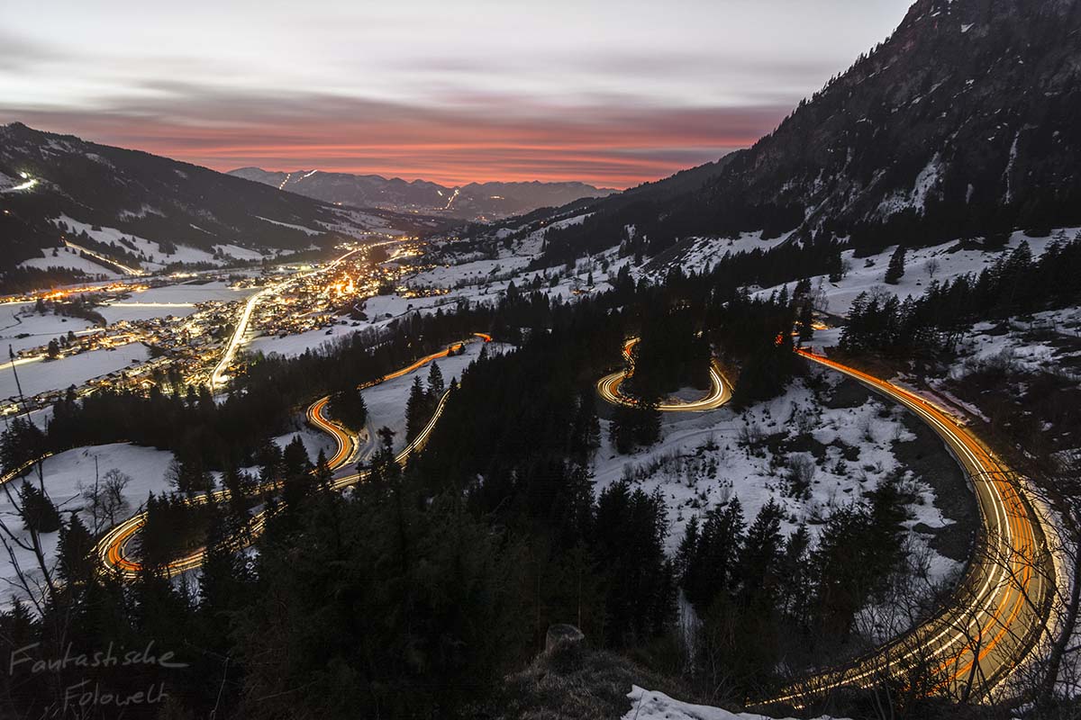 Zur maximalen Färbung war ich leider im Auto unterwegs, an der Serpentinenstraße in Richtung Bad Hindelang habe ich aber ziemlich genau 1 Stunde nach Sonnenuntergang immer noch ein intensives rot gesehen und fotografiert.