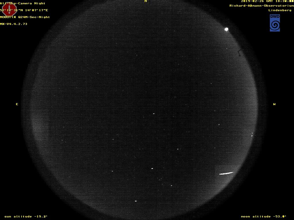 Zur Zeit laufen bei der IMO/AMS Beobachtungen einer Feuerkugel über dem Südwesten Deutschlands ein. Sie trat am 26. Februar 2019 um 19:37 MEZ (18:37 UTC) auf. Ein schneller Check auf dem Bilderserver der Kamera zeigte dann auch ordnungsgemäß die Spur von Lindenberg aus.