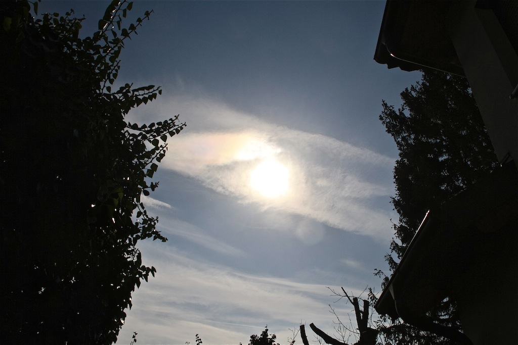 im gegenwärtigen Azorenhoch über Mitteleuropa ist der Himmel ständig mit Schlieren von Cirren hier und da verhangen. Aussichten auf optische Phänomene sollten da vielversprechend sein, aber es tat sich gestern mit Ausnahme einer leichten linken NS so gar nichts an den Eiswolken, noch nicht einmal der Mond, der leicht verschleiert war, zeigte etwas auffallendes.