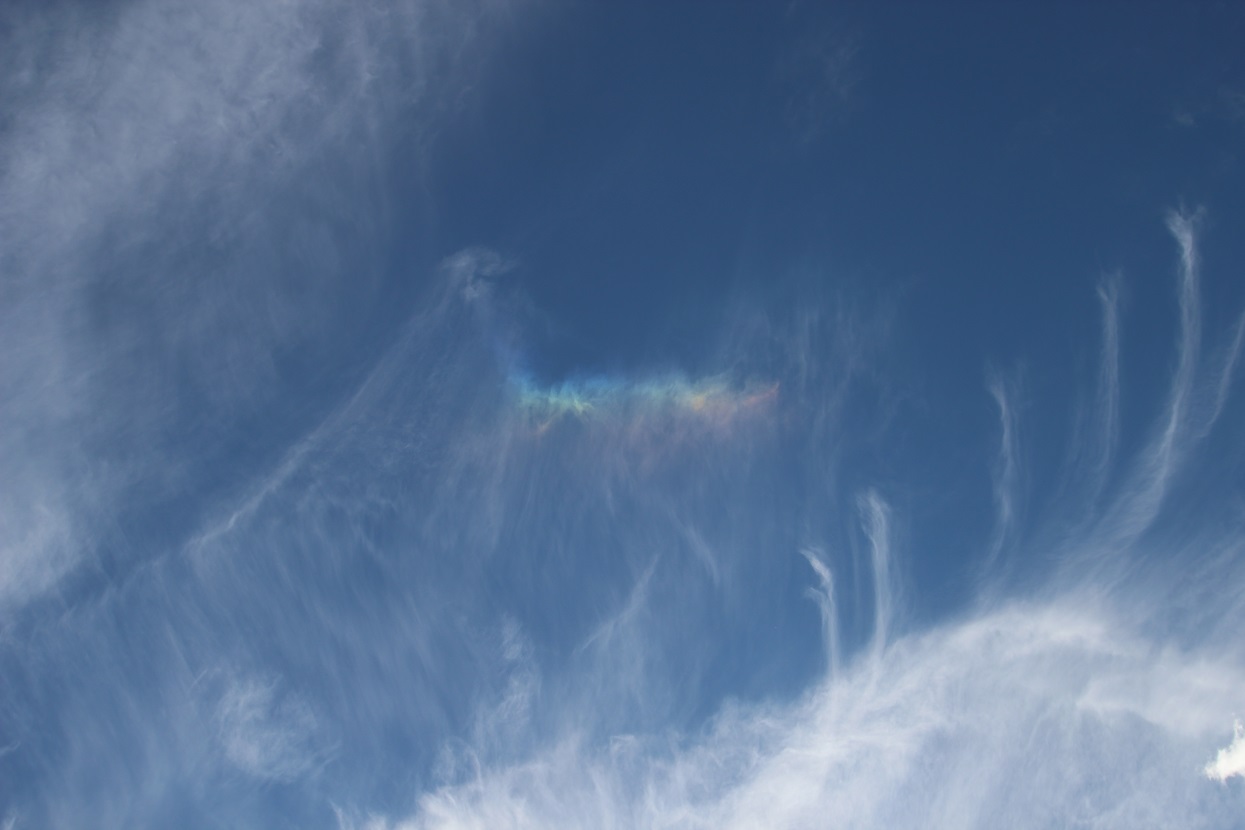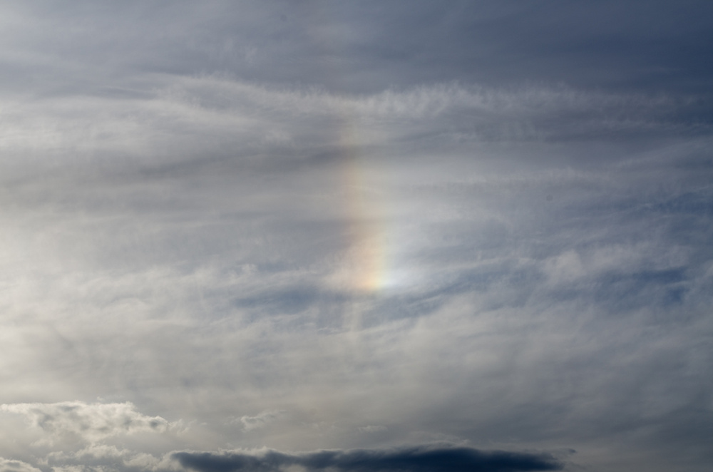 Um 15:55 konnte ich eine farblich sehr schöne Nebensonne und ein Stück Horizontalkreis beobachten(und merkwürdiger farblicher Fleck im 18° Bereich auf HZK wie eine 18° Nebensonne