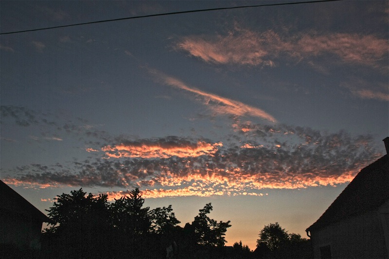 Heute früh, vor der heranziehenden Gewitterlinie, gab es um 5 Uhr Sommerzeit = 4 Uhr MEZ zunächst etwas Morgenrot zwischen Quellwolken: