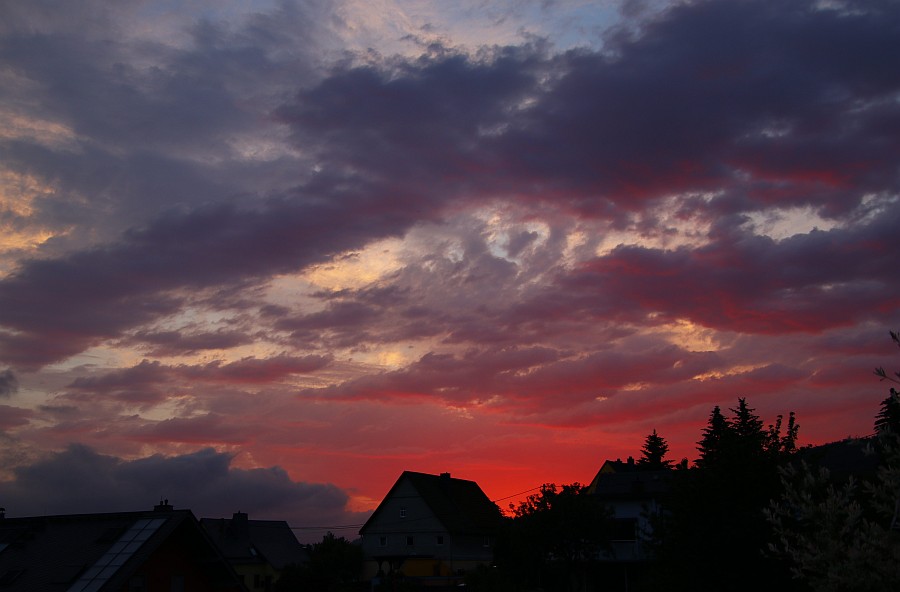 Abendrot vom 7. Juni (Freitag): Regenbogen von gestern (8.Juni): Und rote Wolken von gestern abend: