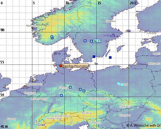 Bei Durchsicht der Cam-Archive fällt auf, dass die Leuchtenden Nachtwolken zwar bis unterhalb des 47. Breitengrades sichtbar waren, aber überall in etwa die gleiche Horizonthöhe aufwiesen. Ausmessungen mehrere Frames verschiedener Cams und die anschließende Eingabe der gefundenen Azimuth- und Höhendaten bestätigten dann die Vemutung, dass offenbar mehrere unterschiedliche NLC-Felder in Erscheinung traten (Abb. 3). Ebenso ist es natürlich denkbar, dass es sich ein durchgehendes von Skandinavien bis weit nach Mitteleuropa reichendes Feld sehr geringer optischer Dichte gehandelt hat, von dem nur einzelne Bereiche in Folge günstiger Sichtgeometrie nachgewiesen werden konnten.