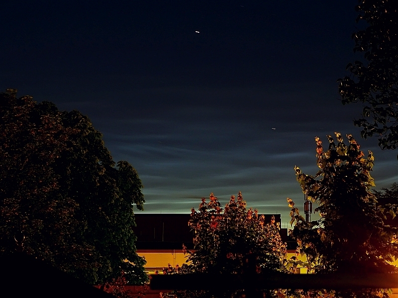ich konnte die NLCs hier vom Garten aus sehen (Abb. 1), bis zunächst troposphärisches Gewölk davor zog. Helligkeit zu dem Zeitpunkt 3.