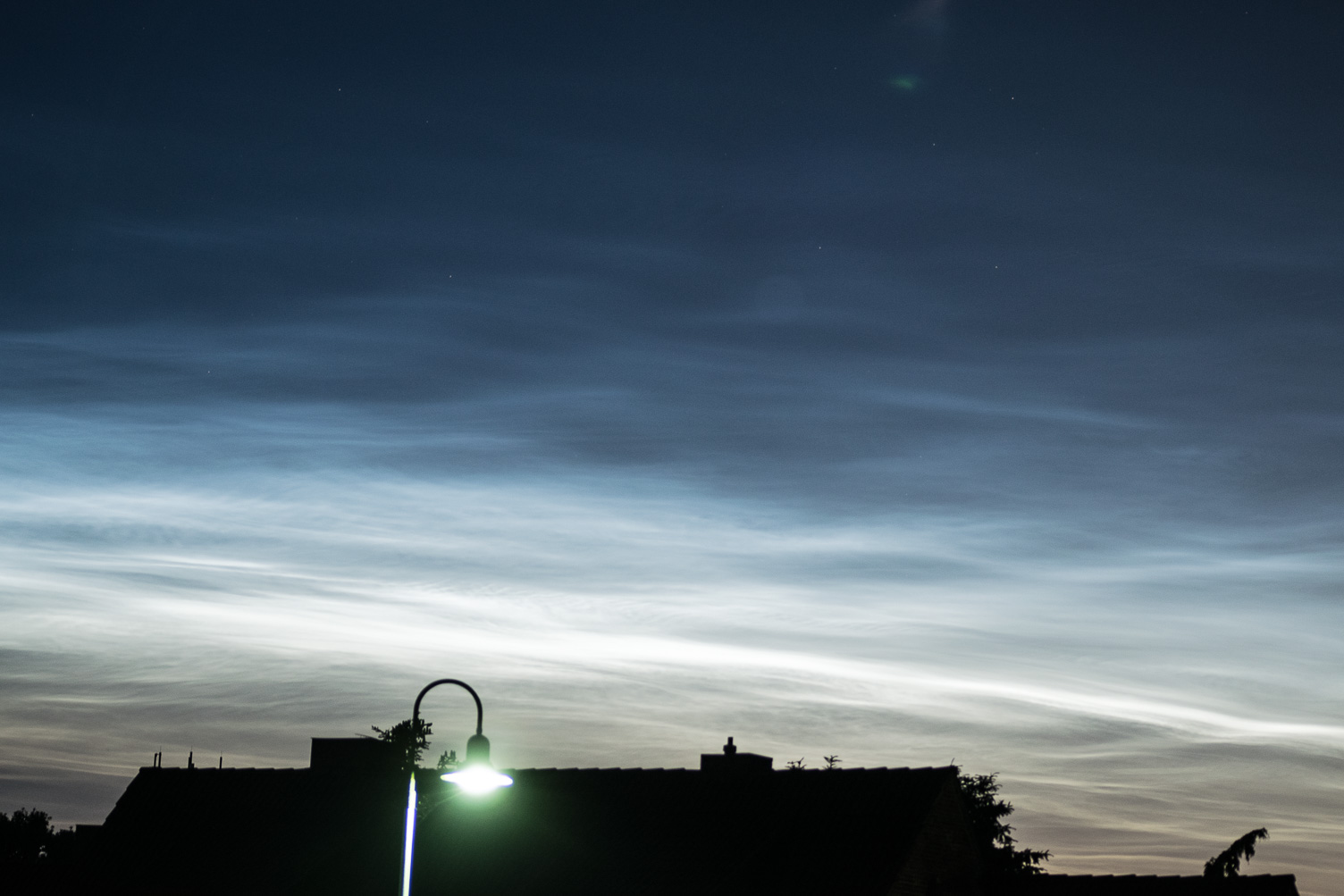 Auf eine Fahrt aus dem Ort heraus habe ich verzichtet, da ich nicht damit rechnete, dass diese Schauspiel noch lange anhält. Eine kleine Lücke zwischen den Häusern ermöglichte den Blick Richtung Horizont und ich war mir im ersten Moment nicht sicher, ob diese sehr hellen Wolken auch NLC waren. Aber sie bewegten sich Richtung Westen. Also war Objektivwechsel angesagt.
