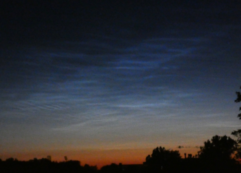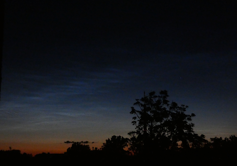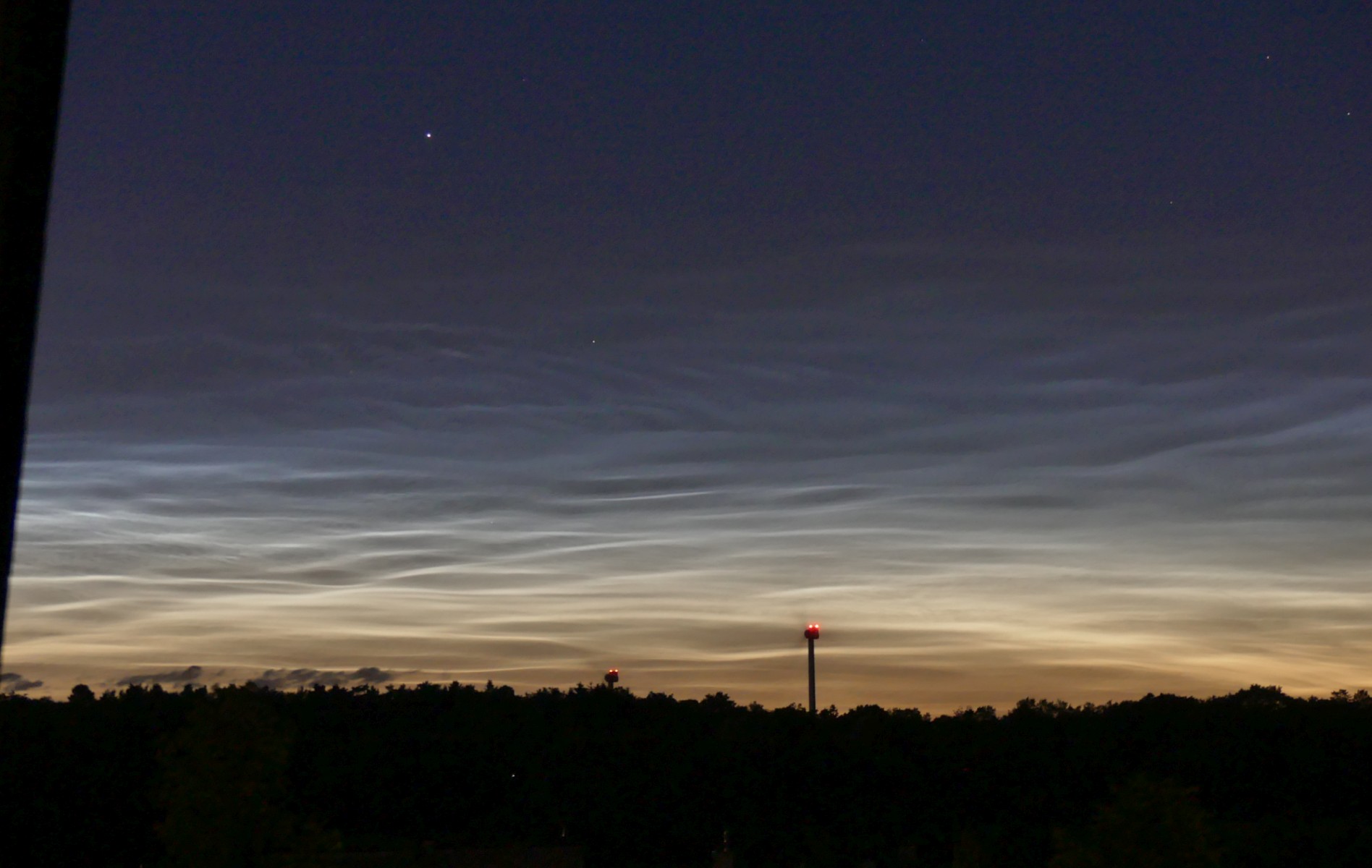 Von mir auch ein paar NLC-Bilder aus Bochum. Um kurz nach 23 Uhr sah ich noch einmal aus dem Nordfenster im Hausflur, um zu überprüfen, ob vielleicht Leuchtende Nachtwolken da wären. Nun, die Überprüfung fiel positiv aus: