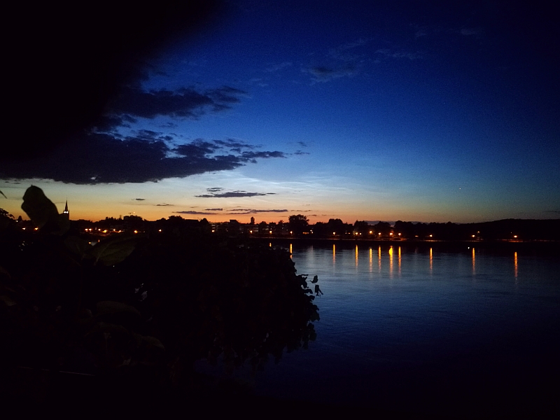 Da nun nicht mehr mit einem wirklich spektakulären Display zu rechnen war, ging ich nur mit der Handy-Cam ausgerüstet zum Rheinufer runter. Dort war das NLC-Feld sichtbar (03:51 MESZ) - etwa von Azimuth 20 - 70° bei einer Höhe von lediglich 12° (Kapella stand ziemlich genau an der Oberkante). Da sich in den folgenden 20 Minuten an der Höhe nichts änderte, sah ich hier also den tatsächlichen Südrand des Displays, welcher sich ungefähr von Cuxhaven bis nach Halle/Saale erstreckte.