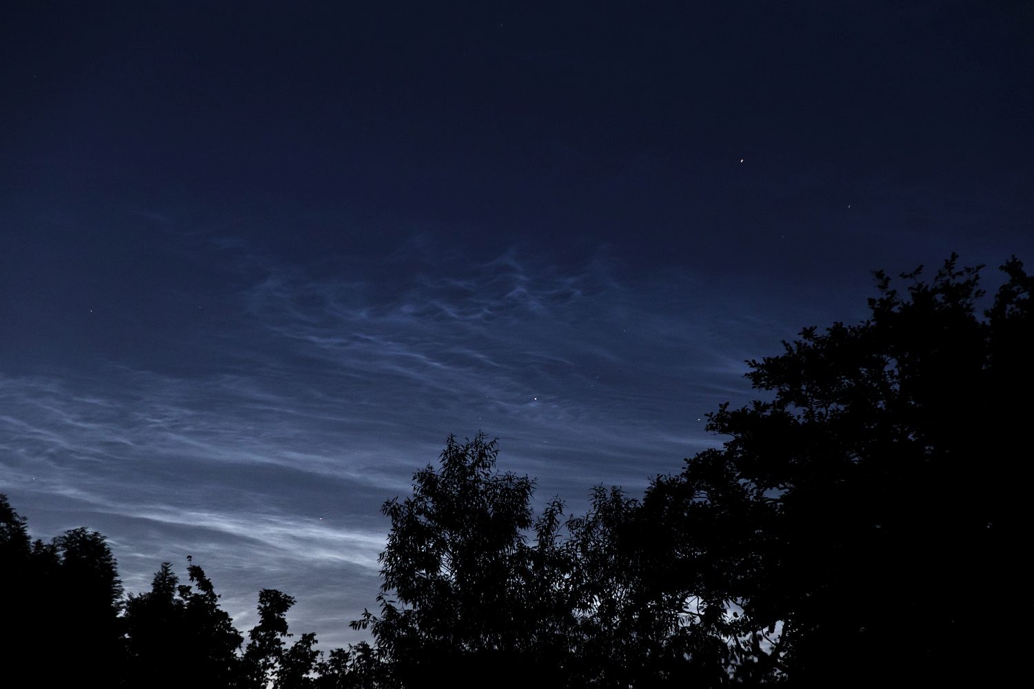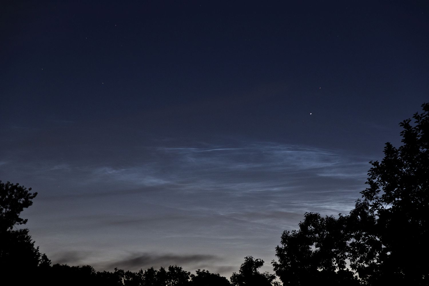 Hier die Bilder des Abenddisplays: 23:19 MESZ: Die NLCs stehen circa 10° bis 15° hoch, Helligkeit 3-4 23:47 MESZ: Die NLCs stehen circa 5° bis 7° über dem Horizont, Helligkeit 3