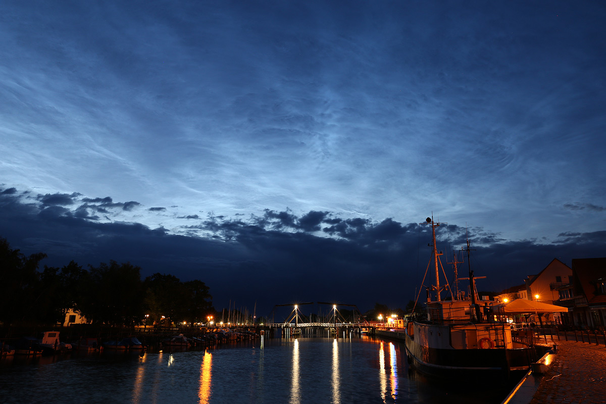 Kaum waren die NLC zu sehen, waren sie auch schon wieder hinter dem aufziehenden Schundwetter verschwunden. Das Bild zeigt nur Reste der NLC, auf dem Weg zum Ryck konnte ich noch deutlich höher stehende weitere Elemente des Displays sehen, aber als ich wenige Minuten später am Fluß war, hatten die Gewitterwolken diese schon geschluckt. Die Helligkeit würde ich mal grob mit 3 angeben, aber zu viel "Hans guck in die Luft" konnte ich dann auch wieder nicht machen, so das diese Angabe mit Vorsicht zu genießen ist. Ich blieb dann noch ein wenig und konnte unter anderem diesen Schnappschuss machen, bevor die Unwetterfront auf dem Regenradar im Handy mir dann doch zu nahe kam und ich die Flucht ergriff.