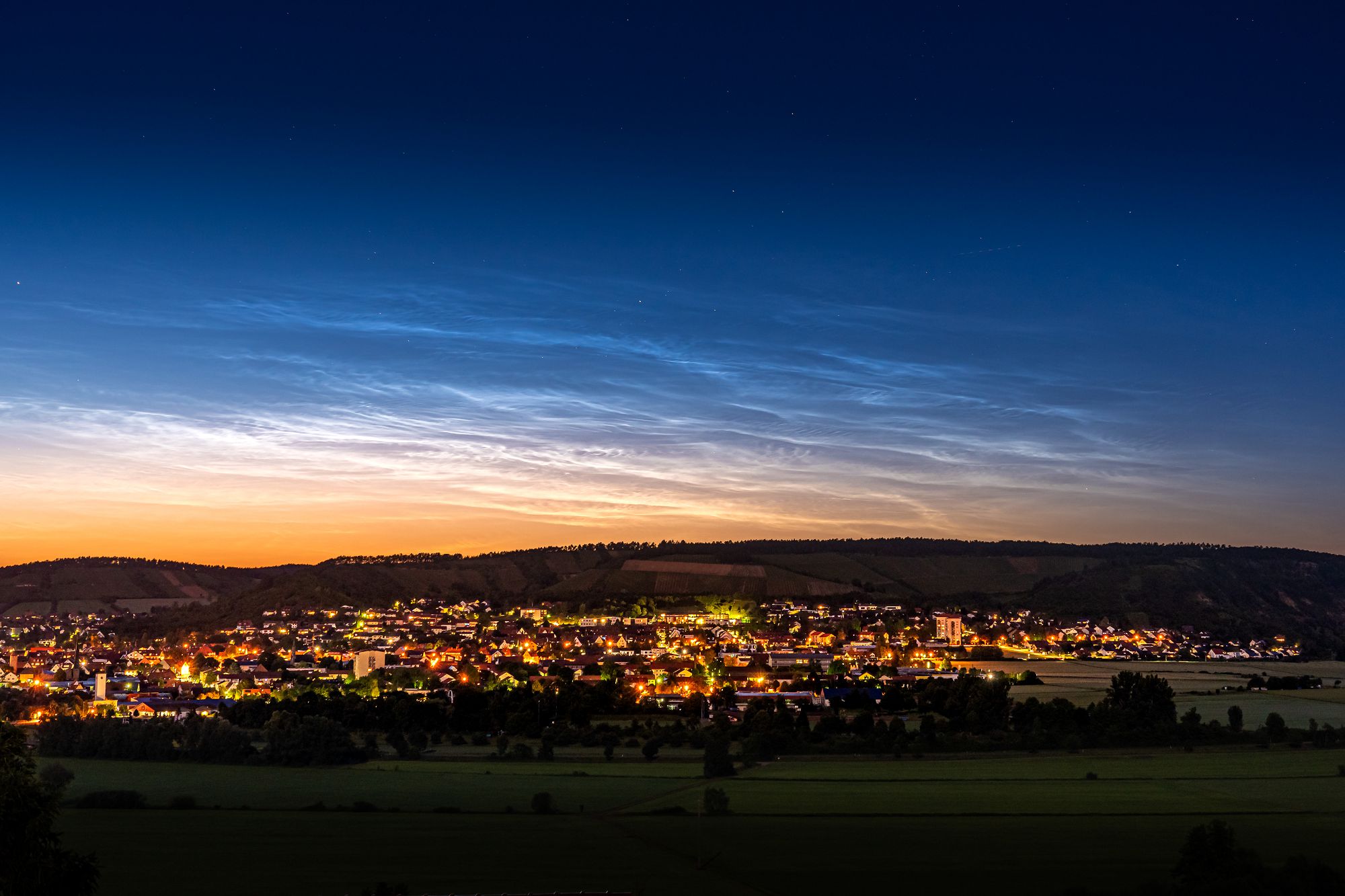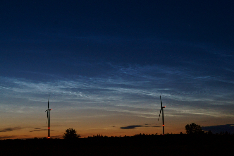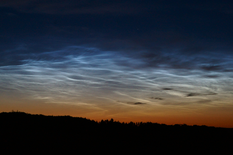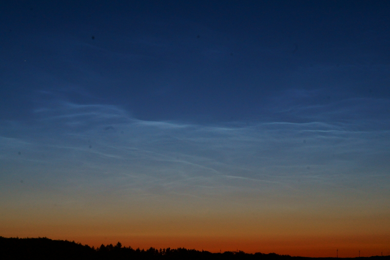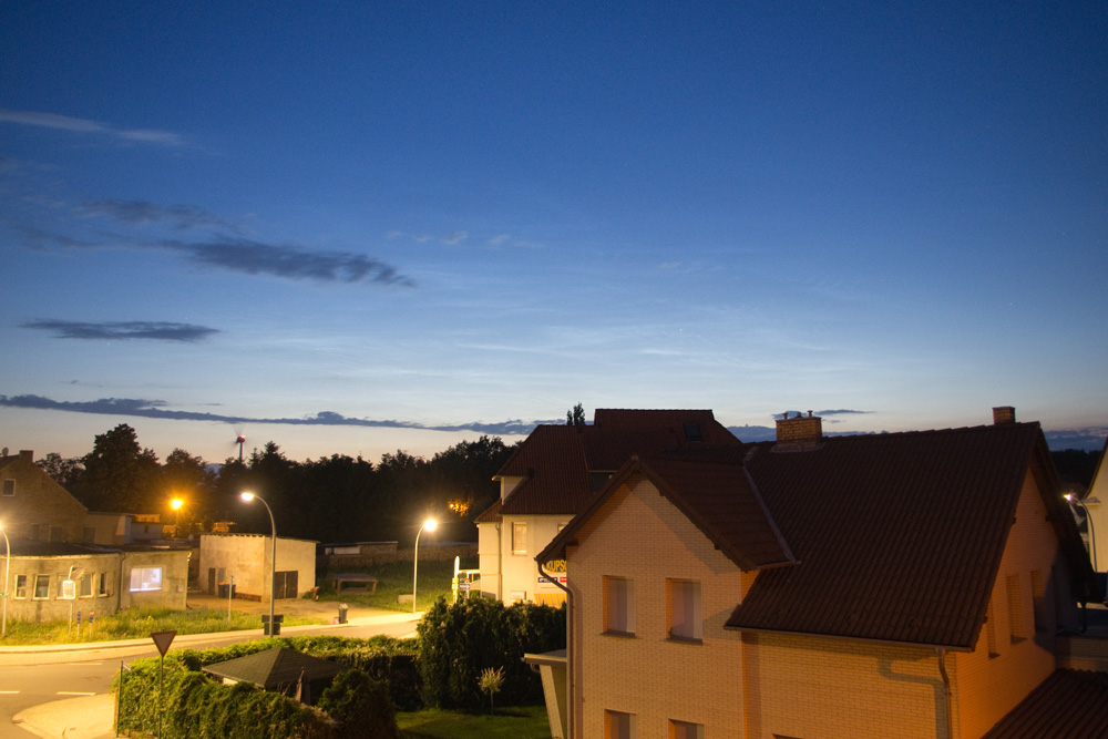 ich habe die NLC gestern abend in Hörlitz auch sehen können, nachdem die letzten Tage wegen Gewittern keine Beobachtung möglich war. Beobachtungszeit 22:30-23:00, Höhe max. 20°, Azi 320°-0°, Helligkeit 2, Typ IIb. War für mich als Gelegenheitsbeobachter ein schöner Einstieg in die Saison. Hier ein Bild von 22:49 MESZ (f=18 mm, f/3,5, Pentax K-5, 2 s bei ISO 400):