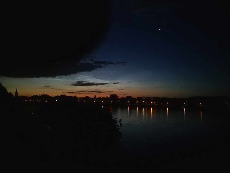 Da nun nicht mehr mit einem wirklich spektakulären Display zu rechnen war, ging ich nur mit der Handy-Cam ausgerüstet zum Rheinufer runter. Dort war das NLC-Feld sichtbar (03:51 MESZ) - etwa von Azimuth 20 - 70° bei einer Höhe von lediglich 12° (Kapella stand ziemlich genau an der Oberkante). Da sich in den folgenden 20 Minuten an der Höhe nichts änderte, sah ich hier also den tatsächlichen Südrand des Displays, welcher sich ungefähr von Cuxhaven bis nach Halle/Saale erstreckte.