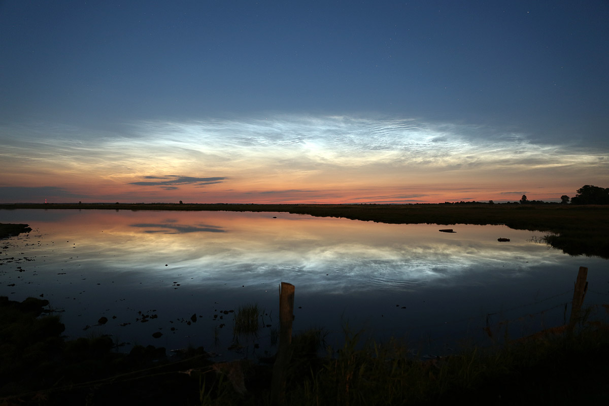In Greifswald war letzte Nacht zur Abwechslung mal klarer Himmel und dazu gab es sehr schöne und helle NLC zu sehen. Ich habe diesmal einen etwas weiteren Ausflug gemacht und bin gerade erst heim gekommen. Daher erstmal nur eine kurze Zusammenfassung mit zwei Fotos. Der Aufnahmeort ist etwa 10 Kilometer nördlich von Greifswald.