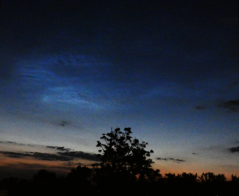 aus Wien vom Bisamberg aus (Breite 48,3°) war es ziemlich wolkenverschleiert, aber die hellsten Sterne waren sichtbar. Die NLCs waren freisichtig als deutliche Aufhellung erkennbar. Mit der Kamera war mehr erkennbar (Canon 600D, f=24mm 1:4).