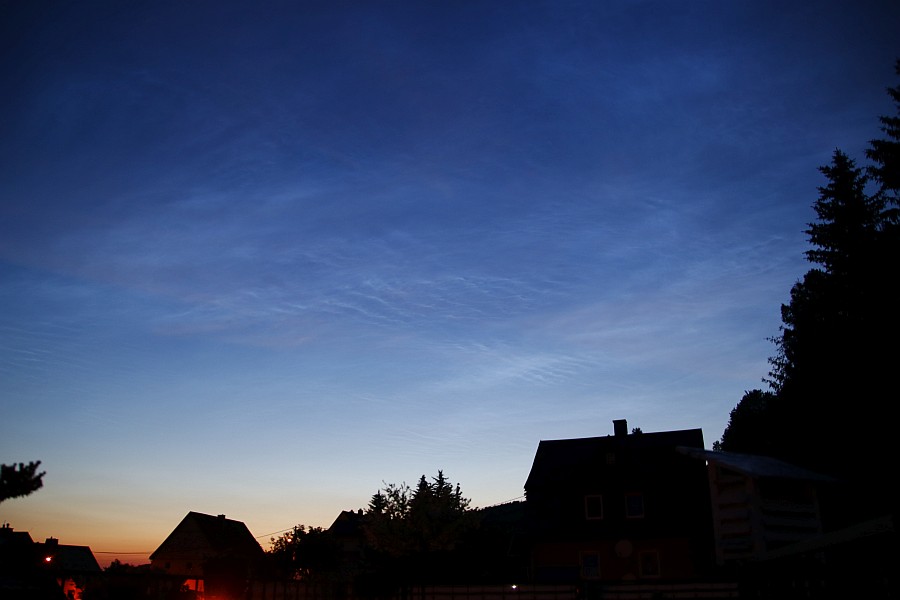Dann hab ich ja doch richtig geguckt- hab erst gedacht, ich spinne, als um ca 23:15 NLCs bis hoch zum Zenit und noch weiter nach SO reichten... Als ich an meinem Beobachtungsplatz angekommen bin, standen die dann schon weiter westlich und nicht mehr ganz so hoch.War aber ein sehr breites Feld, reichte von WNW bis NNO... genaue Gradzahlen sind leider nicht drin, weil der Handyakku platt war...
