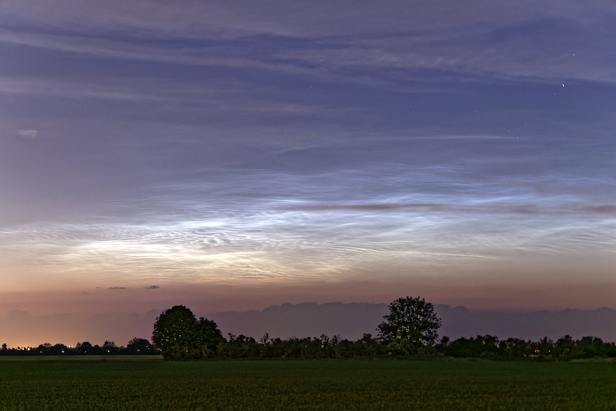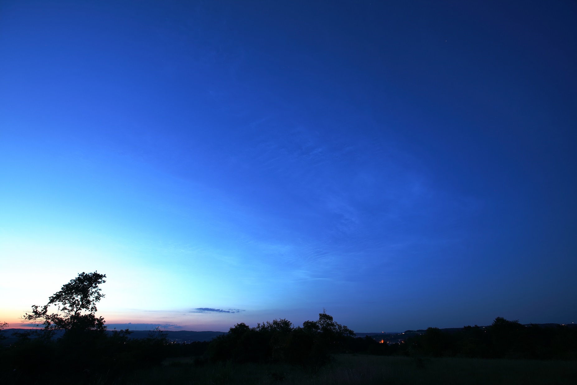 Standort Magdalenenhausen bei Wetzlar (70 kn mördlich von FFM), ca. 50.54N, 8.4E - ab ca. 22:10 - 22:15 zeichneten sich die ersten NLCs weit im Osten ab. Und zwar fast bis Vega. also 70° Nordazimut, bis fast in den Zenit. Sie drangen dann weiter in Richtung Westen vor, und standen gegen schätzungsweise 22:45 bis ca. 10° über den Zenit nach Süden!